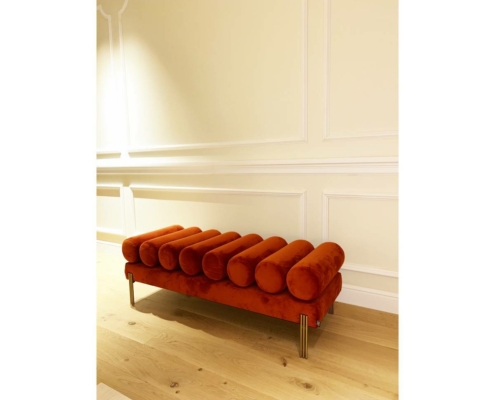 Tombez dans la sensation luxueuse et souple du banc Oxley. Méticuleusement conçu, le somptueux rembourrage de l'Oxley crée une sensation invitante, ce qui en fait l'expérience de relaxation ultime pour votre chambre ou votre couloir. Avec sa finition en laiton brossé, le banc Oxley est recouvert de velours orange savona pour un look somptueux du milieu du siècle.